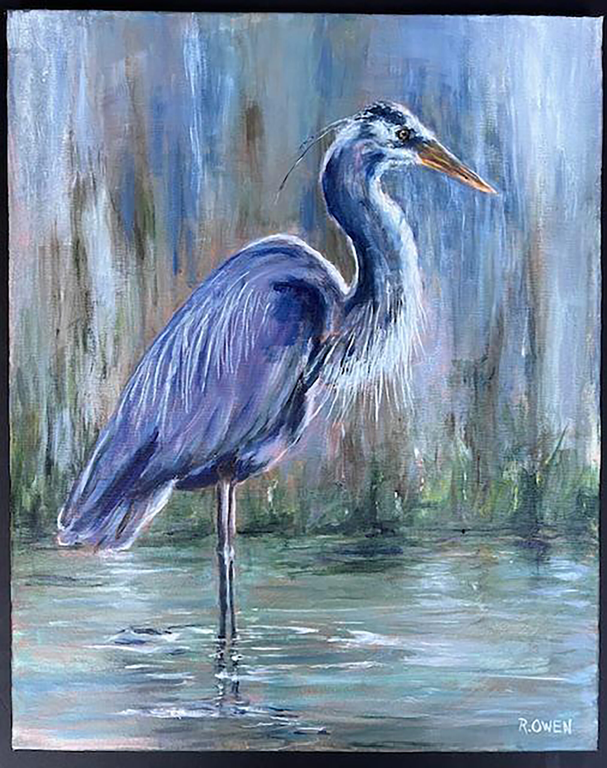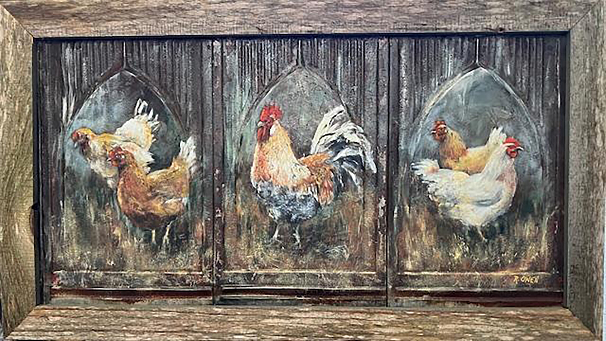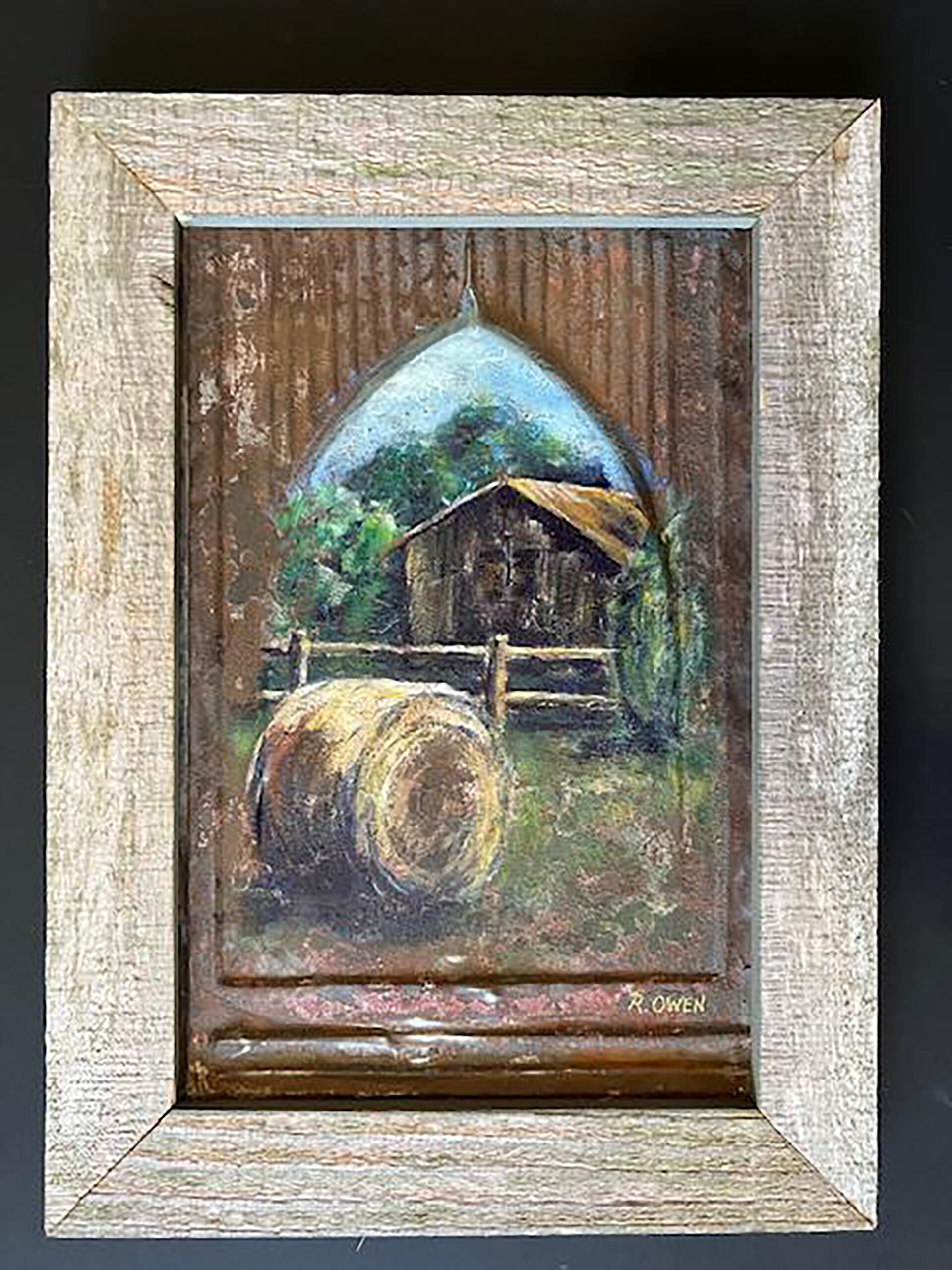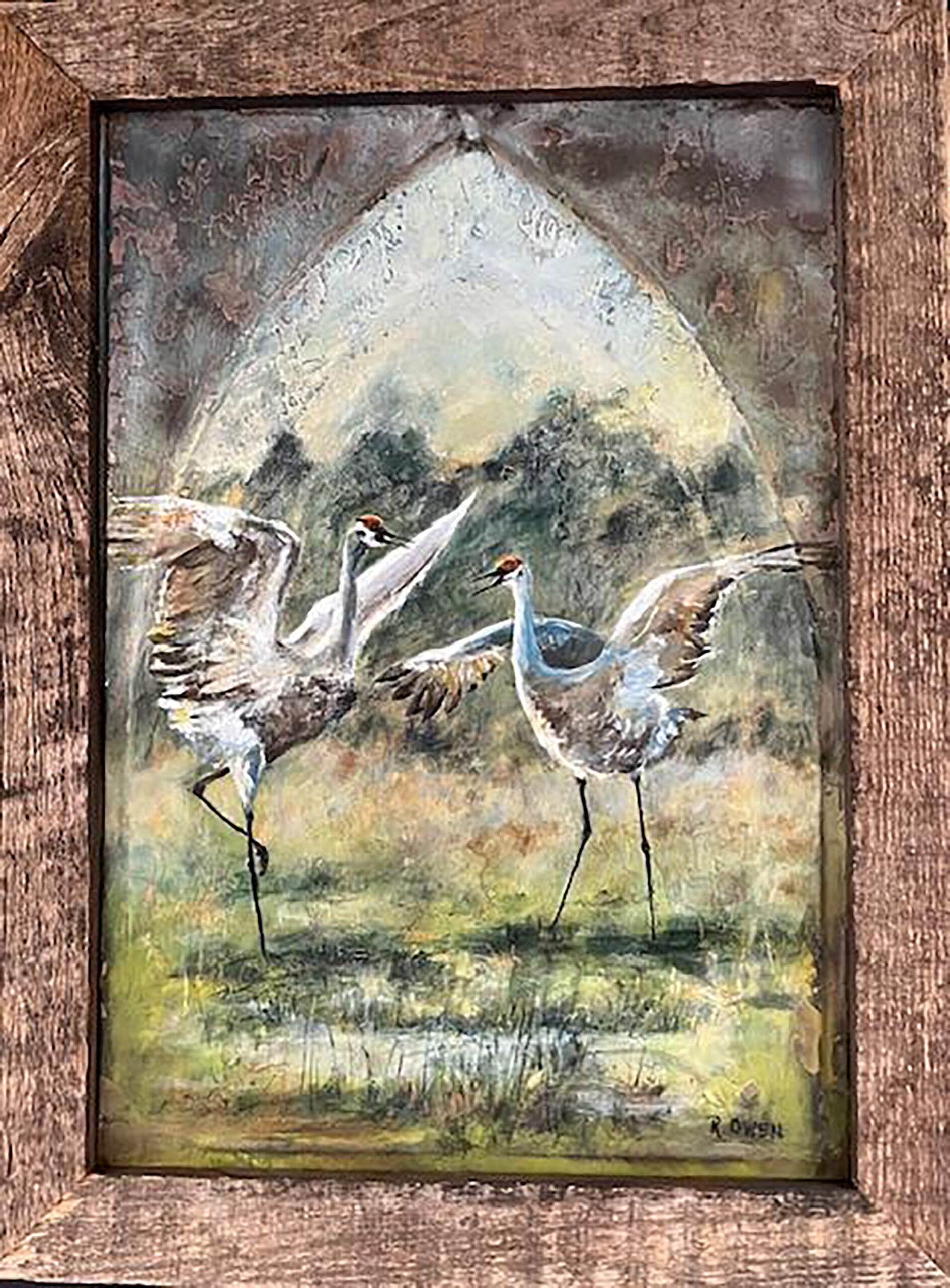 “From my earliest memories, the beauty of our natural world has been a love and passion. In my paintings I try to capture a bit of that beauty, be it a landscape, an animal, bird, or insect. Each has a unique statement. Many of my works are traditional oils on canvas. However, a favorite substrate for my acrylic work is metal roof shingles reclaimed from old homes and churches. I clean much of the rust and layers of paint from them and love the irregular surface that remains. It seems to relate to the nature and scenes I love to paint. My wish is that the viewer will be drawn in by the colors and surfaces as much as by the subject, seeing something new each time.”